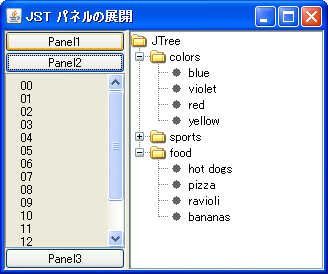 上記のサンプルでは、ボタンが押されるたびにそのパネルの展開と折り畳みを行い、同時にBorderLayoutの北、中央、南に各パネルを振り分けています。このため展開されるパネルはひとつだけになります。