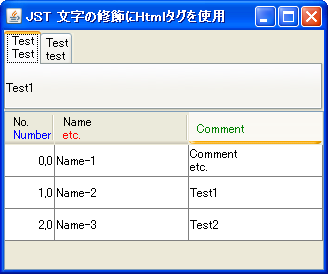 上記のサンプルでは、JTableのヘッダとJTabbedPaneのタブにhtmlタグを使用しています。<p>タグなどで簡単に改行するとこができます。