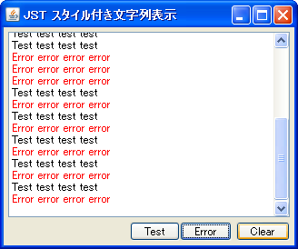 StyleConstantsで文字属性をSimpleAttributeSetに設定し、 予め設定しておいたエラー表示用のスタイル(文字属性)を、StyledDocument#getStyle("error")で取得し、これを文字列と一緒にDocument#insertStringメソッドを使って挿入しています。