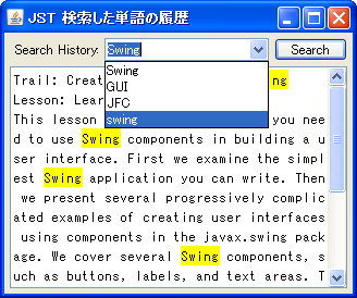 JComboBoxに検索する文字列が入力されて、検索ボタンが押されるたびに履歴を更新しています。上記のサンプルでは、4個まで履歴を保存し、それ以上は古いものから消されます。履歴にある文字列が再度検索された場合は、それを一番上に移動しています。
