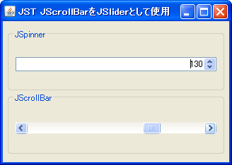 上記のサンプルでは、JScrollBarをJSliderとして使用し、JSpinnerと連動させています。JScrollBarに設定する最大値は、スクロールバーのノブ(extentはノブの幅)の右ではなく左端になるように調整する必要があります。