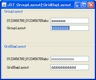 JDK 6 で新しく導入されたGroupLayoutとGridBagLayoutを比較しています。GroupLayoutのサンプルは、APIドキュメントの例をそのまま引用しています。